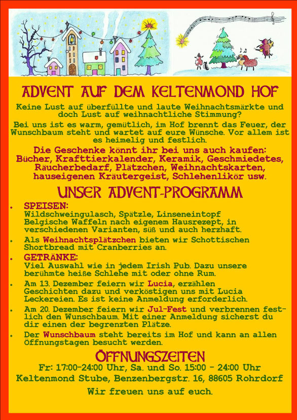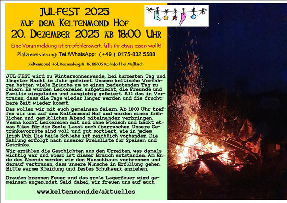 Bei dem Fest geht es darum, die längste Nacht im Jahr zu verabschieden und sich über die längere Tage zu freuen. Es geht um Zuversicht, dass die neue fruchtbare Zeit kommt und die Sonne hoch im Himmel steht. Es geht auch um die Vorbereitung für die Raunächte. Wir werden die Geschichten aus uralter Zeit erzählen und am Ende des Abends den Wunschbaum, mit unseren Wünschen, in die Anderswelt durchs Feuer schicken. Was dazwischen passiert entscheiden wir gemeinsam. Wir haben einige Vorschläge und Überraschungen.