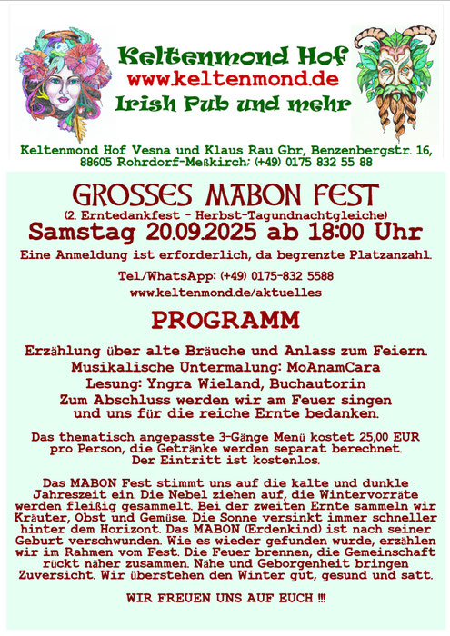 Die Jahreskreisfeste auf dem Keltenmond Hof gehen weiter. Bis Ende des Jahres sind es noch drei Jahreskreisfeste: Mabon, Samhein und Jul-Fest. Dazu kommen noch die "Geister von Benzenberg" zum 01. November und unsere Advent-Wochenenden im Dezember.
