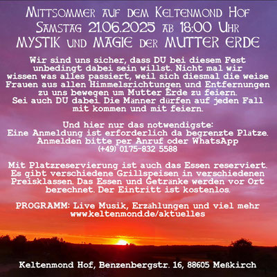 Liebe Freunde und Gäste. Oben sind alle Jahreskreisfeste für 2025aufgelistet. Die Anmeldungen können sofort gemacht werden.
